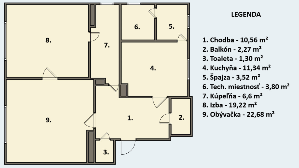 Do bytu sa vstupuje cez priestrannú chodbu, ktorá spája jednotlivé miestnosti. Z chodby je ďalej prístup do izby, WC, kuchyne, na balkón, do kúpeľne. Kúpeľňa je priechodná a dá sa cez ňu vojsť do druhej izby. Do tejto izby je inak prístup cez prvú izbu. Z kuchyne sa vstupuje do dvoch malých miestností (špajza, technická m.)
