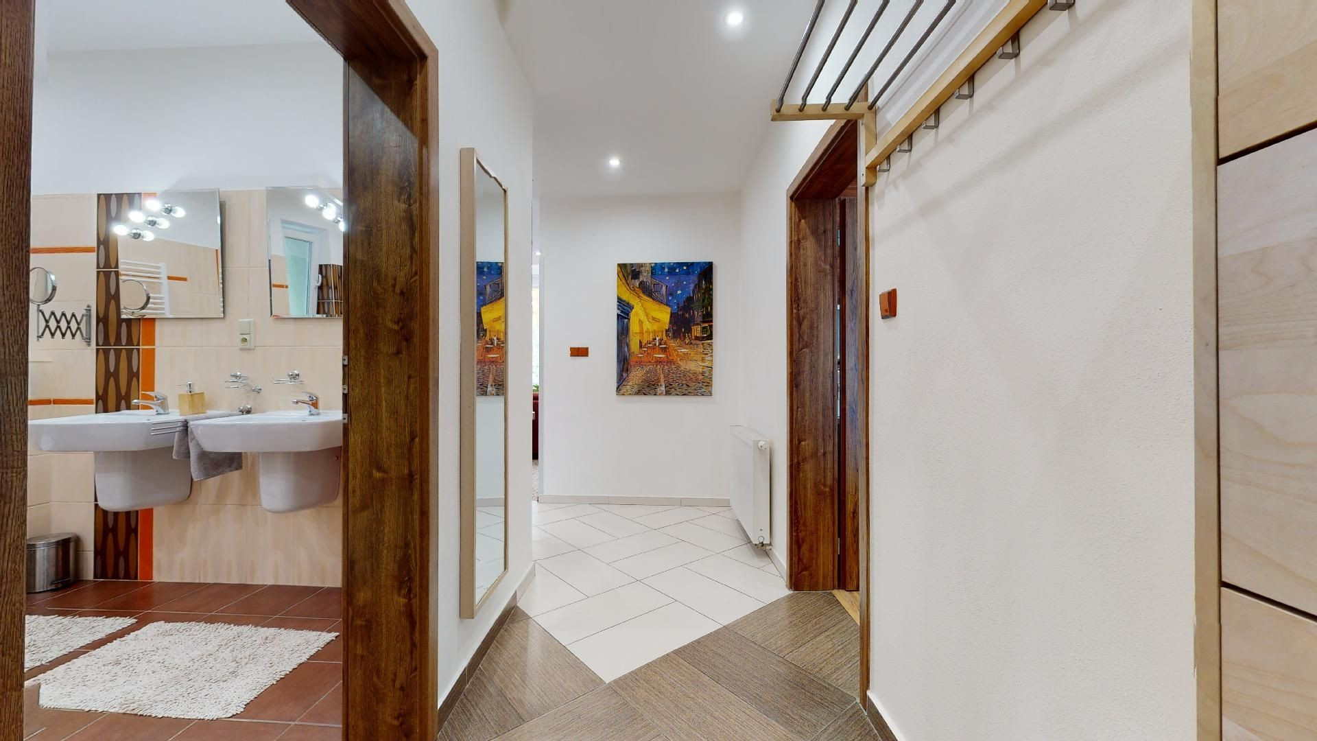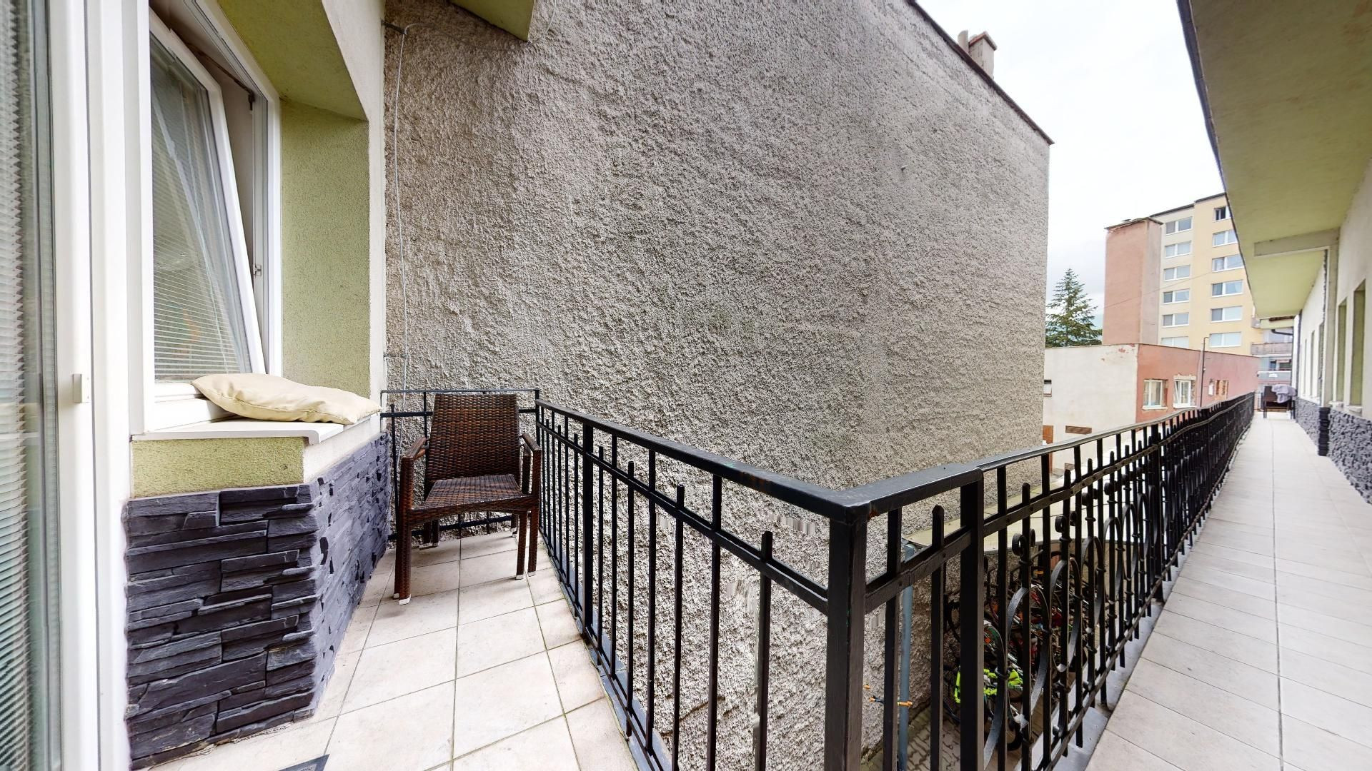 Do bytu sa vstupuje cez chodbu, z ktorej sa po ľavej strane vstupuje do kúpeľne s WC a po pravej do detskej izby/pracovne. Z tejto izby je taktiež výstup na balkón/pavlač. Na konci chodby sa nachádza priestranná obývačka s kuchynským kútom. Z obývačky sa ďalej vstupuje do spálne.