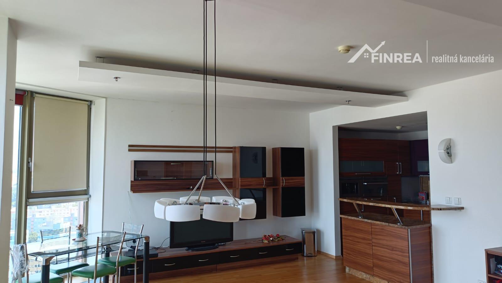 Vďaka veľkým oknám a nadštandardnej výške je byt svetlý, vzdušný a ponúka panoramatické výhľady na okolie Petržalky aj smerom na centrum.