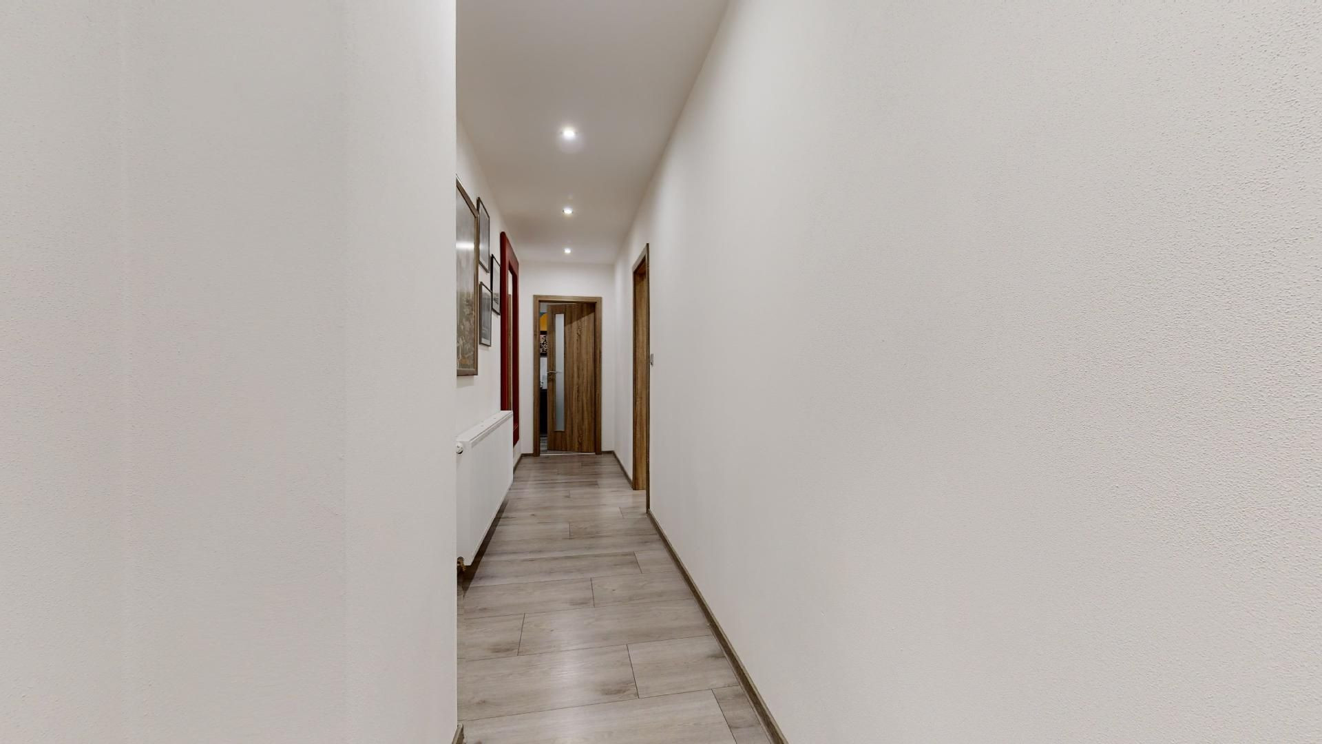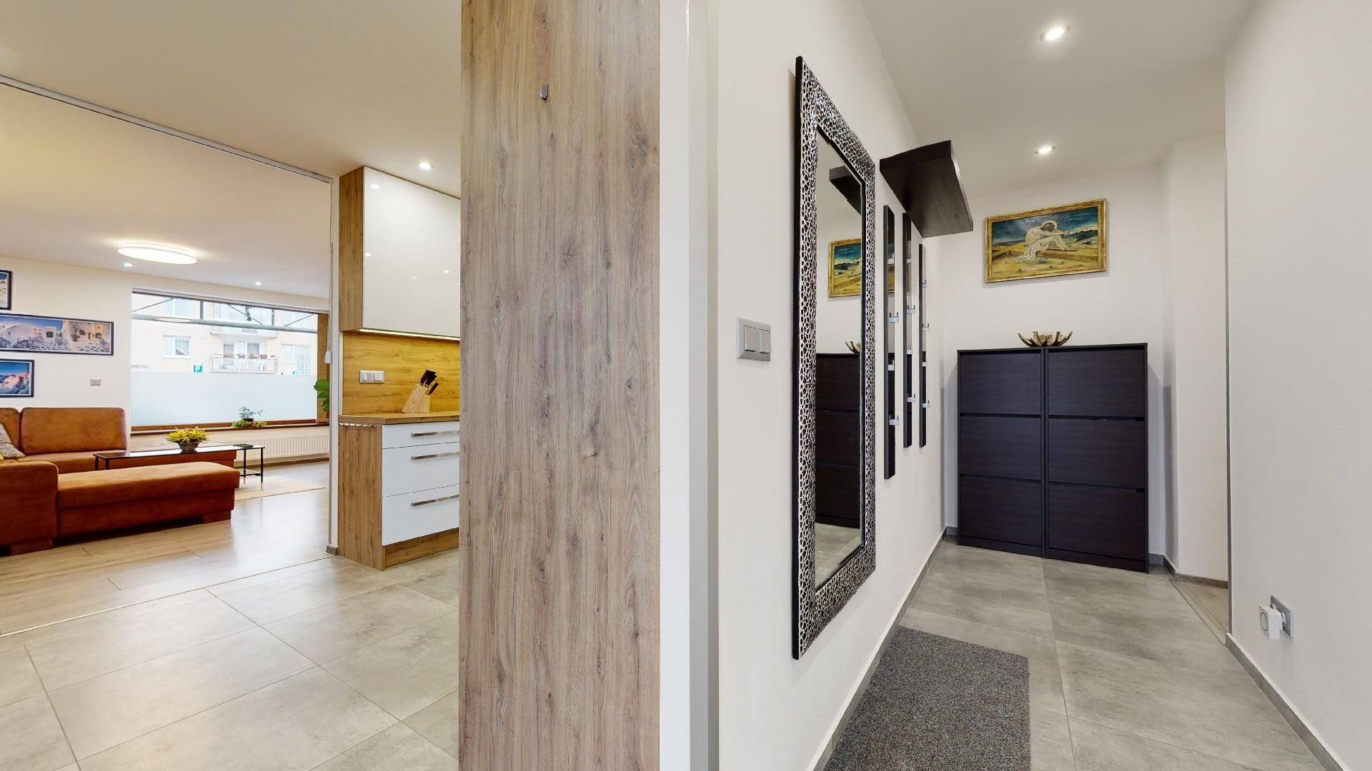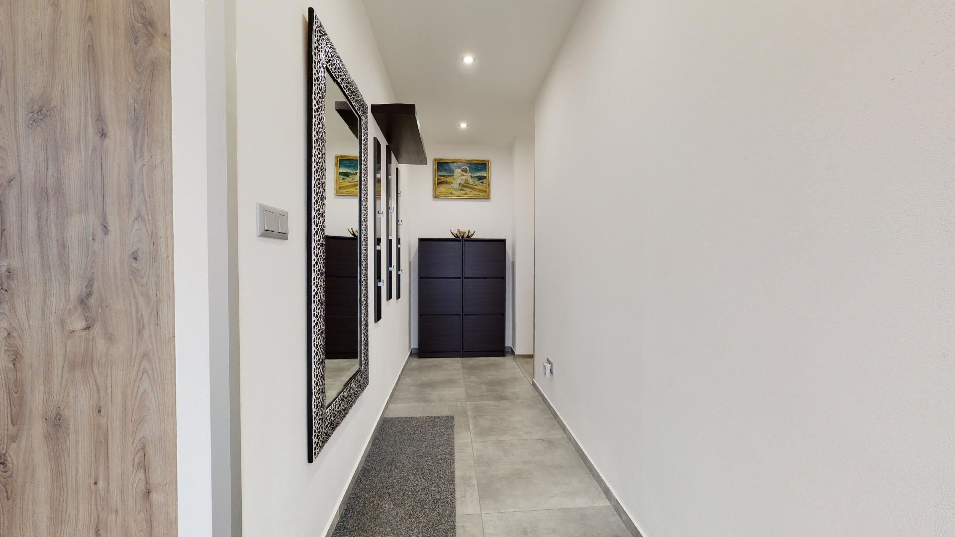 Do bytu sa vstupuje cez chodbu, z ktorej sa po ľavej strane vstupuje do kuchyne s plynulým prechodom do obývačky. Po pravej strane pokračuje chodba, z ktorej sa dostanete do spálne, detskej izby, kúpeľne a technickej miestnosti s druhým WC. Na terasu je vstup zvonka - – ideálne miesto na rannú kávu či večerný oddych..