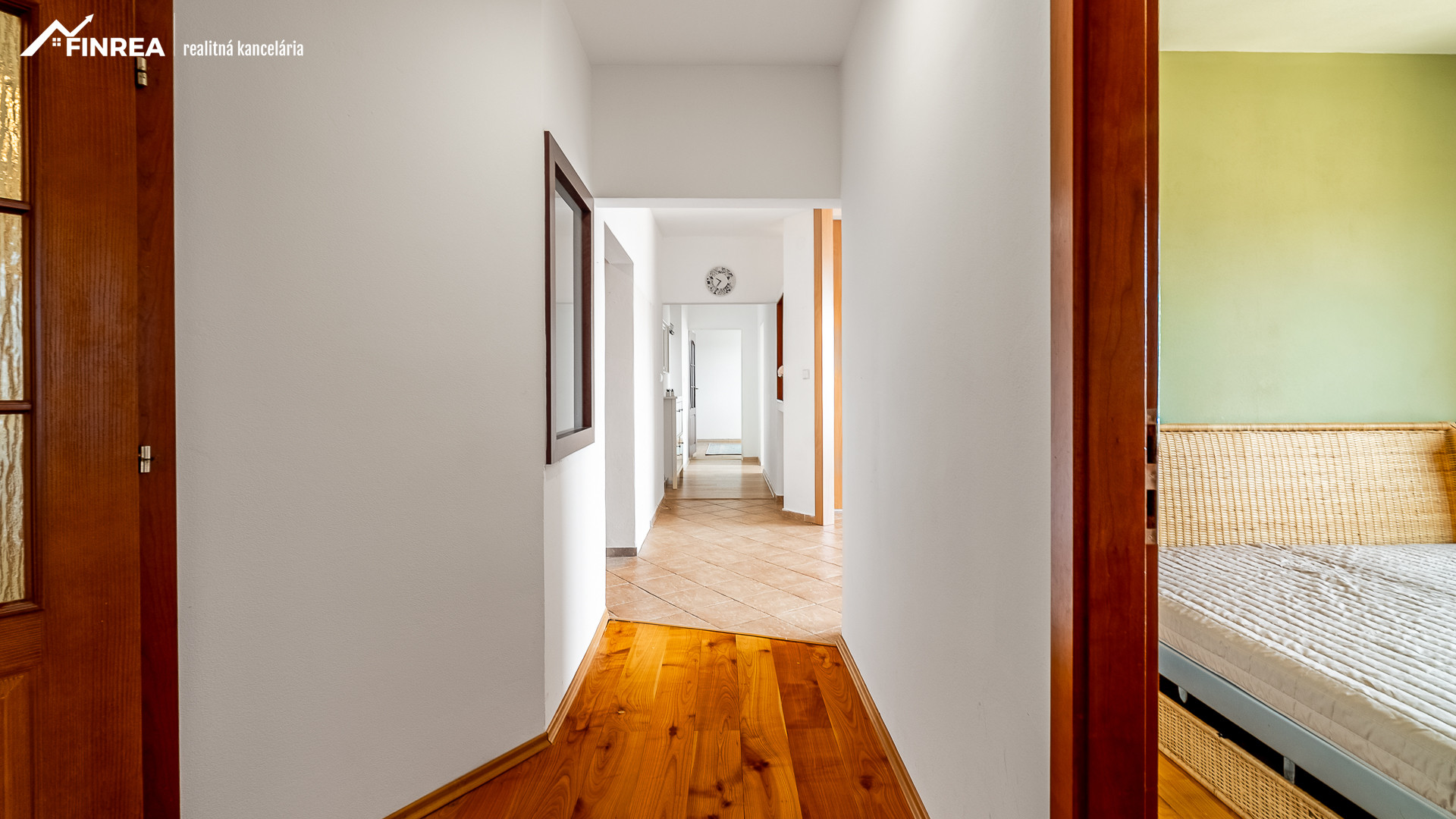 Byt ponúka príjemnú dispozíciu vhodnú pre rodinné bývanie - priestranná vstupná chodba vedie do všetkých štyroch nepriechodných izieb. Spojená kuchyňa s obývačkou tvorí miesto na stretnutia s rodinou a kúpeľná spojená s WC.